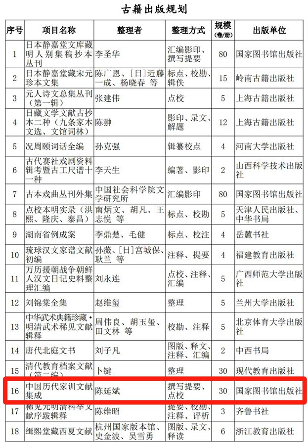 “十四五”国家重点出版物出版规划是我国出版业最高级别的出版专项规划,此次增补将图书部分的“古籍出版规划”纳入《2021—2035年国家古籍工作规划》进行专项管理。陈延斌教授主编的古籍整理项目大型丛书《中国历代家训文献集成》,将由国家图书馆出版社编辑出版,共计30卷,该丛书按照全、清、准的要求,对中国历代家训文献批阅爬梳、点校整理,并撰写家训提要,是陈延斌教授三十余年家训整理研究的重要成果。