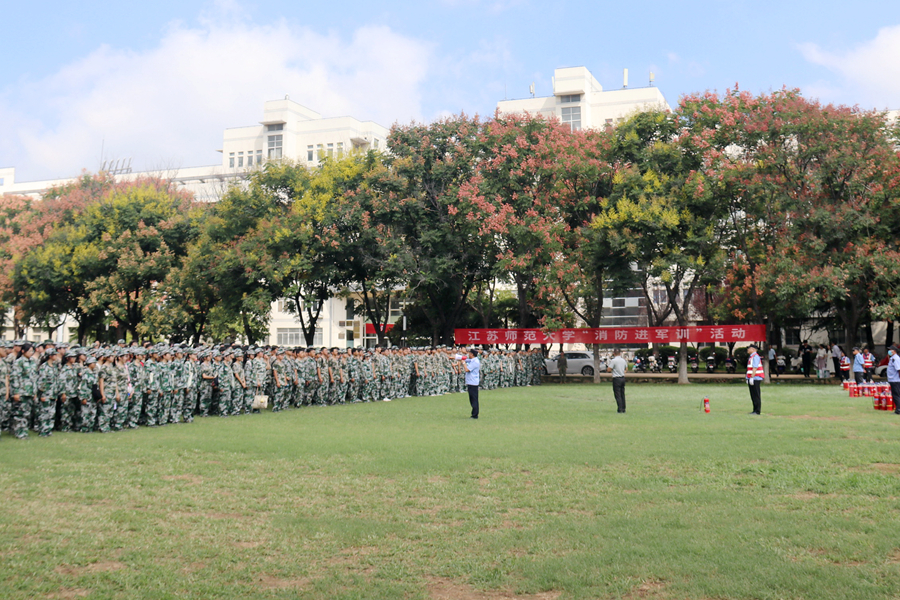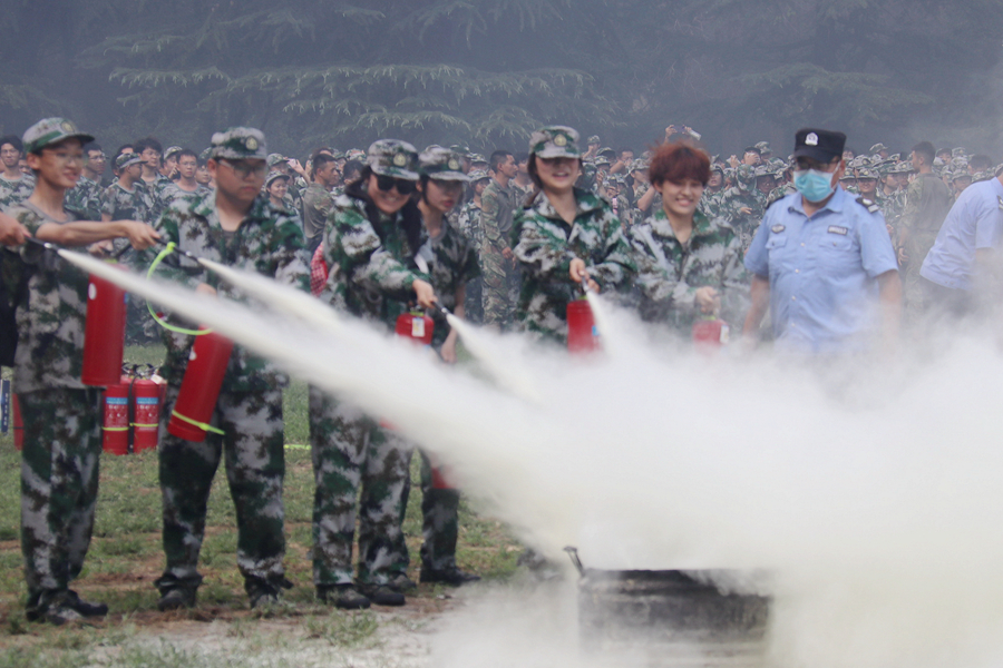 慰问活动后,张玉勤一行深入“消防进军训”现场,观摩了学生消防灭火演练活动。