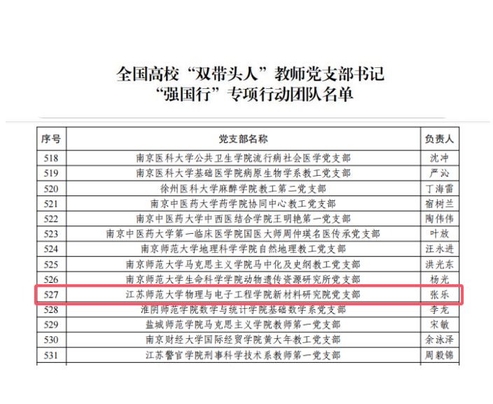 近日,教育部公布了遴选产生的全国高校“双带头人”教师党支部书记“强国行”专项行动团队名单,我校物理与电子工程学院新材料研究院党支部张乐教授团队成功入选。