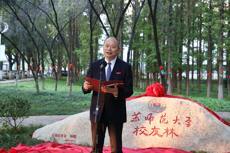 方忠在讲话中表示,“感恩于心,铭志于树,寄情于林”是深入中国人文化基因的浪漫情怀。今天,我们把“铭记师恩”与“寄情于林”相结合,将“校友林”打造成为校友和母校心心相印、守望相助的绿色纽带和实物载体,以蓬勃生长、岁岁芳意的林木传承厚重深沉、历久弥新的苏师精神。站在新的发展起点上,学校更需要凝聚四海校友的智慧和力量,诚挚期盼广大校友继续关心、支持、融入母校发展,学校也将继续加大对校友工作的重视与支持力度,不断加强学校与校友、校友会之间、校友之间的融合发展,进一步打造校友与母校发展共同体,使校友工作在学校事业高质量发展进程中发挥更大更重要的作用。