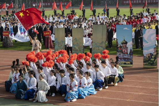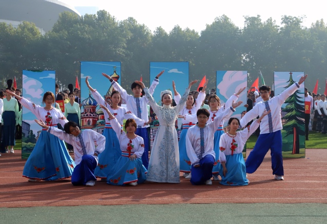 清晨,学院运动会方阵在院领导班子的带领下昂首挺胸,阔步有序的入场。方阵呈现了中国传统文化中的“只此青绿”之韵与俄罗斯民族风情,充分将中俄两国文化融合表现,同时在队形转换间,展示了中俄学子激情向上的精神面貌。观众席也掀起了热烈的掌声和欢呼,交织成一幅多元文化并存与和谐交融的画面。