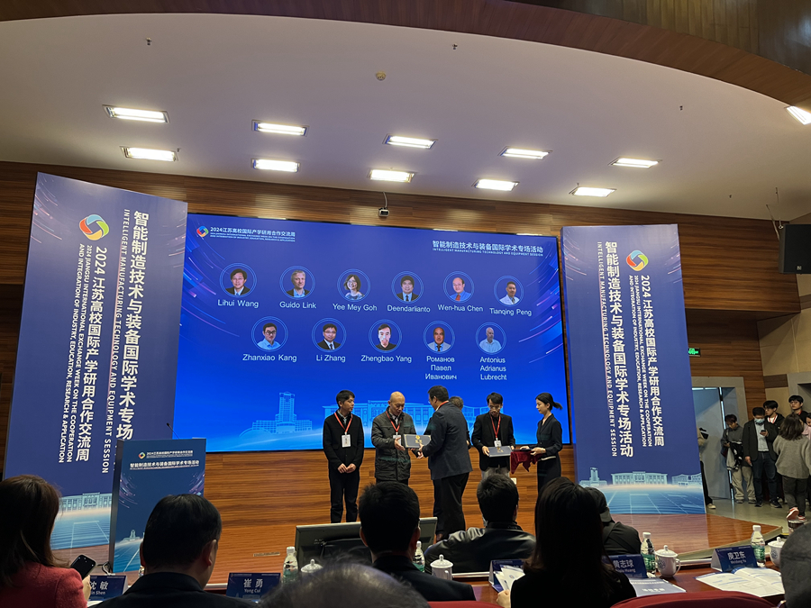 近日,由江苏省教育厅主办的2024江苏高校国际产学研用合作交流周开幕式在河海大学举行。来自34个国家和地区63所高校校领导、院士以及科研机构、国际组织和企业代表等300余人围绕“产学研用深度融合·国际合作共创未来”主题展开深入交流。教育部国际合作与交流司二级巡视员席茹、江苏省人民政府副秘书长邱志强出席开幕式并讲话,省教育厅厅长江涌发表视频致辞,我校党委常委、副校长张玉勤出席开幕式,并在由我校与南京航天航空大学、江苏大学共同承办的“智能制造技术与装备”国际学术专场活动上致辞,国际合作交流处、机电工程学院相关负责人陪同参加活动。