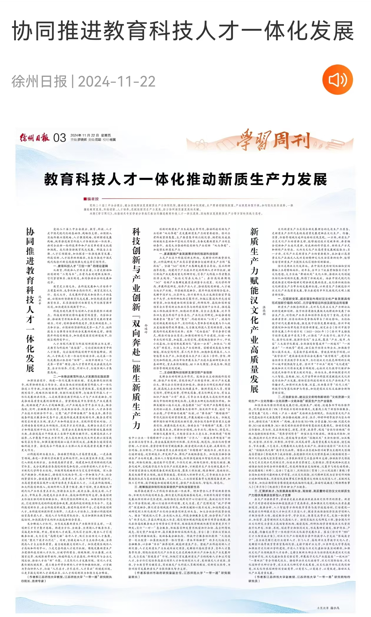 党的二十届三中全会提出,教育、科技、人才是中国式现代化的基础性、战略性支撑。必须深入实施科教兴国战略、人才强国战略、创新驱动发展战略,统筹推进教育科技人才体制机制一体改革。面对全球新一轮科技革命和产业变革的重大机遇和挑战,我们要坚持教育优先发展、科技自立自强、人才引领驱动,加快探索一体推进教育发展、科技创新、人才培养的新路径,为奋力推进中国式现代化徐州新实践提供强大的支撑引领作用。