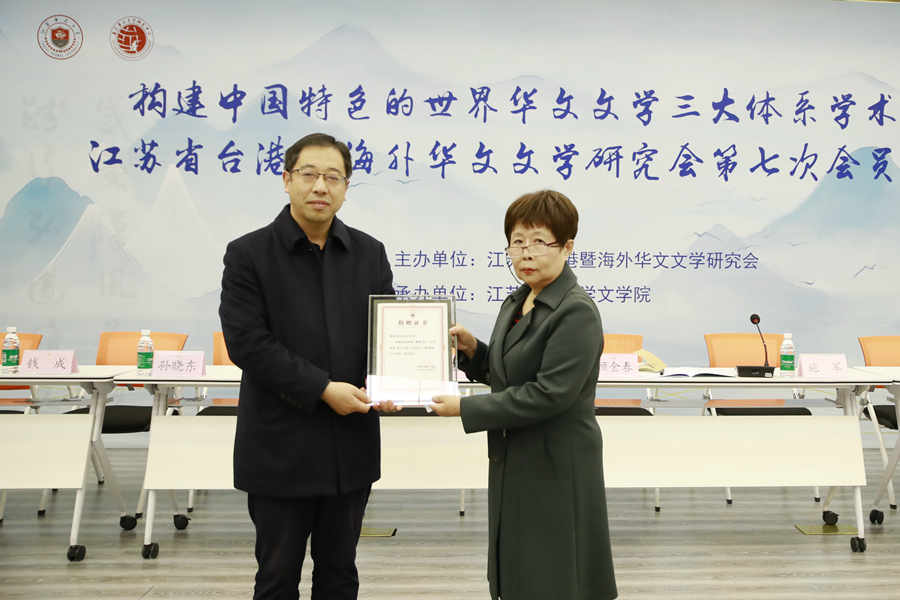 会议期间还举行了图书资料捐赠仪式,江苏省社科院刘红林研究员向我校世界华文文学研究中心捐赠了藏书,文学院相关负责同志向刘林红颁发了捐赠证书。