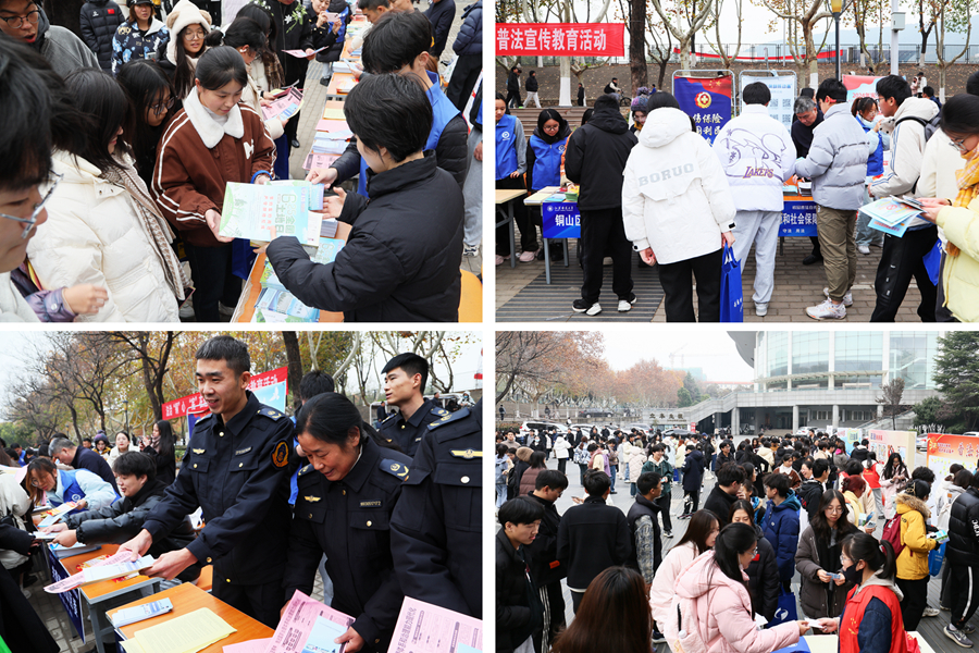 在集中普法宣传教育活动区,来自铜山区政法委、司法局、人民法院、人民检察院、教育局、公安局、应急管理局、人力资源和社会保障局等15家单位的普法宣传员携手江苏师范大学普法志愿者大队志愿者们面向全校师生开展现场普法宣传教育活动,内容涉及《宪法》《民法典》《反电信网络诈骗法》《突发事件应对法》《消费者权益保护法》《食品安全法》《劳动法》等领域。在法治游园会活动区域设置了法治盲盒、法治视力表、法治留言板、法治套圈、法治连连看等游戏环节,广大师生通过参与游戏回答问题、破解法治谜语,掌握宪法知识。活动现场人头攒动,反响热烈。