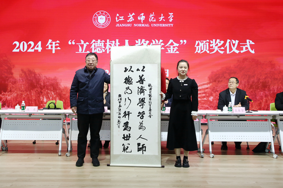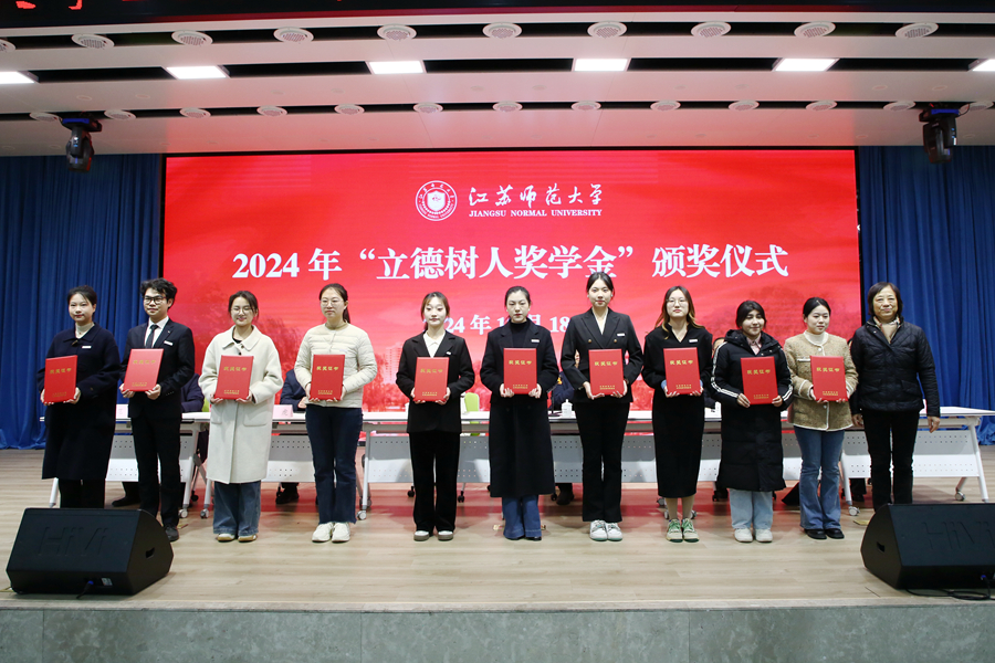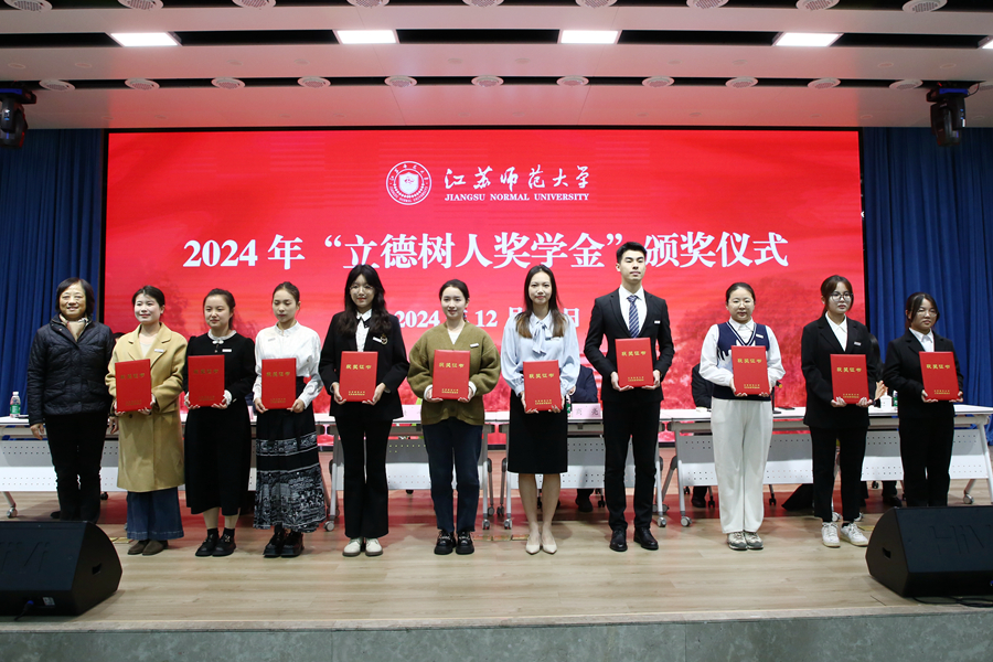 12月18日下午,我校2024年“立德树人奖学金”颁奖仪式在泉山校区路演大厅举行。江苏省教育基金会常务副理事长眭平,校党委常委、副校长商亮,江苏省教育基金会副秘书长陈虎,以及相关职能部门负责人出席会议,全体获奖同学及各学院辅导员、学生代表参加了会议。