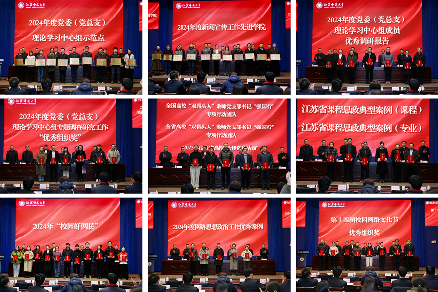 会议对2024年度党委理论学习中心组示范点、新闻宣传工作先进学院、党委理论学习中心组成员优秀调研报告、党委理论学习中心组专题调查研究工作“优秀组织奖”、“校园好网民”、网络思想政治工作优秀案例、第十四届校园网络文化节优秀组织奖,以及全国全省高校“双带头人”教师党支部书记“强国行”专项行动团队、全省高校“最佳党日活动”、江苏省课程思政典型案例等相关获奖集体和个人进行了表彰。