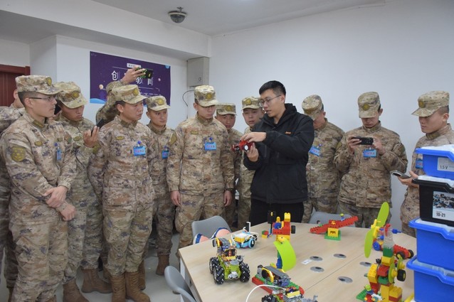 最后,在STEAM课程实验室,王娟教授团队的林威宇同学向官兵们讲解了我院STEAM课程的开展情况,以及美科、乐高、掌控板等编程积木、3D打印机的使用的具体细节。