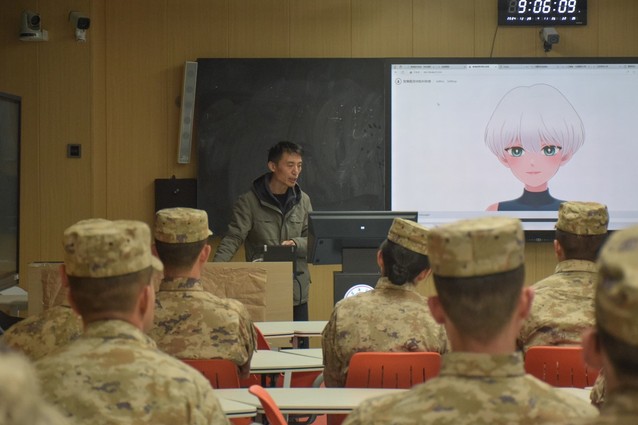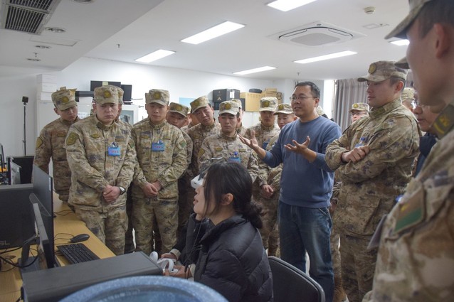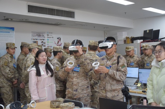 接着,部队官兵参观了学院的虚拟现实开发实验室。胡永斌副教授详细介绍了《课堂问题行为管理虚拟仿真系统》和《5G+VR全景课堂教学观摩系统》的研究进展。前者通过VR模拟,帮助师范生练习管理课堂;后者利用5G和VR技术,让师范生身临其境观摩中小学教学。