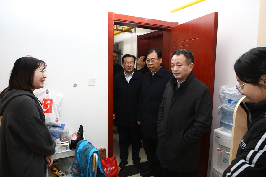 为全面排查治理校园安全风险,切实做好学校寒假期间校园安全工作,1月12日下午,校党委书记芮国强,校长杜增吉,副校长商亮、张其飞等校领导带队开展寒假前校园安全大检查,党委办公室、校长办公室、研究生院、学生工作处、实验室与设备管理处、后勤管理处、基建处、保卫处、后勤集团等单位负责同志陪同检查。