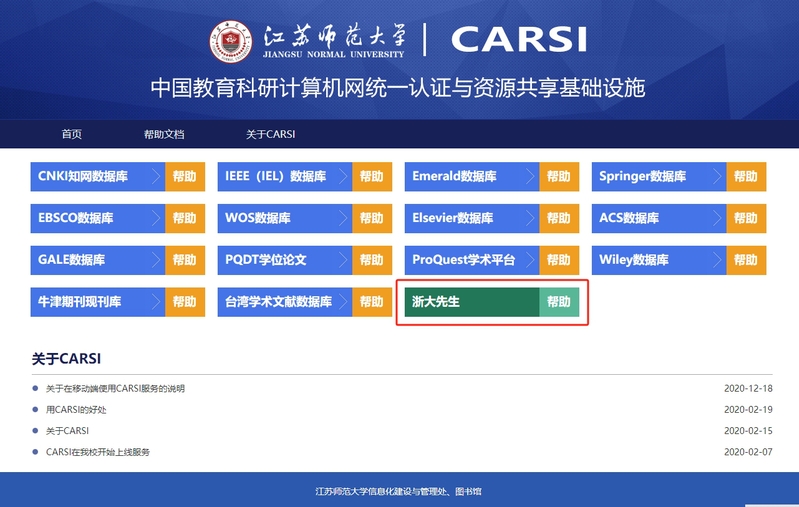 第一步:在爱师大工作台中打开“CARSI”(PC端、手机端皆可),或者在浏览器中输入网址carsi.jsnu.edu.cn,点击“浙大先生”。