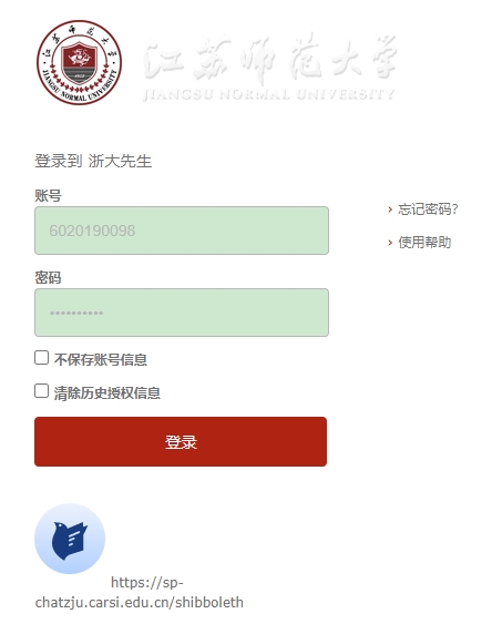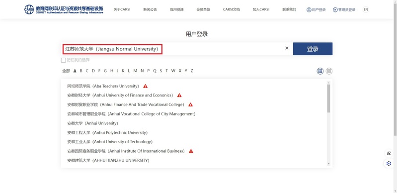 第三步:在用户登录框内,输入并选择“江苏师范大学”,点击登录。