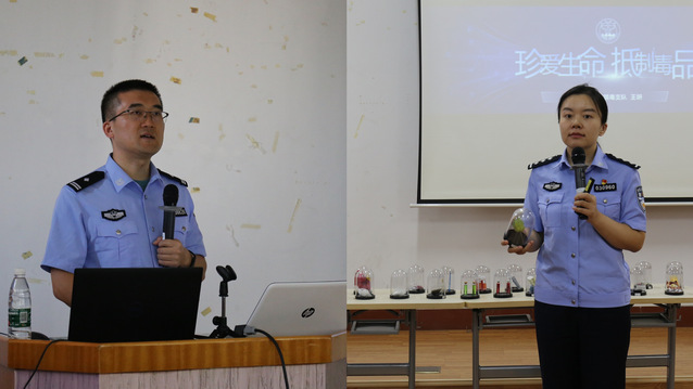 在禁毒教育专题讲座中,王妍警官用汉语讲解,国际学院安排专员进行英语翻译,确保留学生“听明白”、“学明白”。王警官以展示毒品样本导入,介绍了毒品的定义、种类以及毒品的危害和防范新型毒品的有关知识,并强调吸毒对个人、家庭、社会所带来的危害。此次讲座将禁毒教育和反诈教育有机结合,重点针对当前毒情形势,尤其对“笑气”、依托咪酯等物质滥用情况以及法律法规进行解读。最后,警务人员现场发放禁毒宣传资料,向2023级国际新生们赠送定制的禁毒logo钥匙扣,并叮嘱国际学生要深刻认识到毒品离我们并不遥远,要坚决抵制毒品的诱惑。