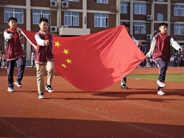 伴随着庄严的国歌声,国旗护卫队迈着铿锵有力的步伐走向升旗台,五星红旗冉冉升起,全体师生肃立注目,齐唱国歌,歌声嘹亮,鼓舞人心。