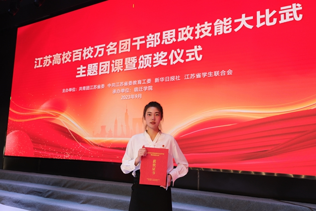9月24日至28日,由共青团江苏省委联合中共江苏省委教育工委、新华日报社、江苏省学生联合会共同举办的“学思想 跟党走 建新功”江苏高校百校万名团干部思政技能大比武决赛在宿迁学院举行。经过决赛评审,我院李彧彤同学代表学校荣获基层团支部书记专项赛一等奖。