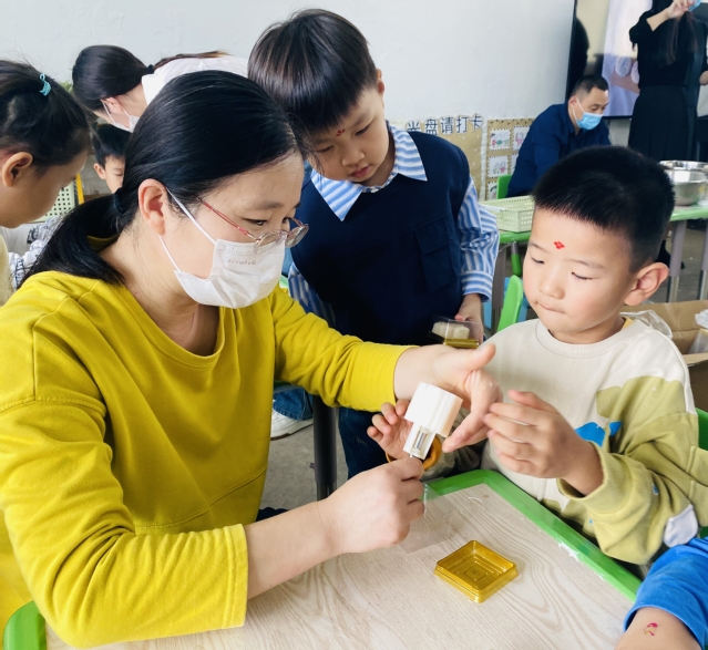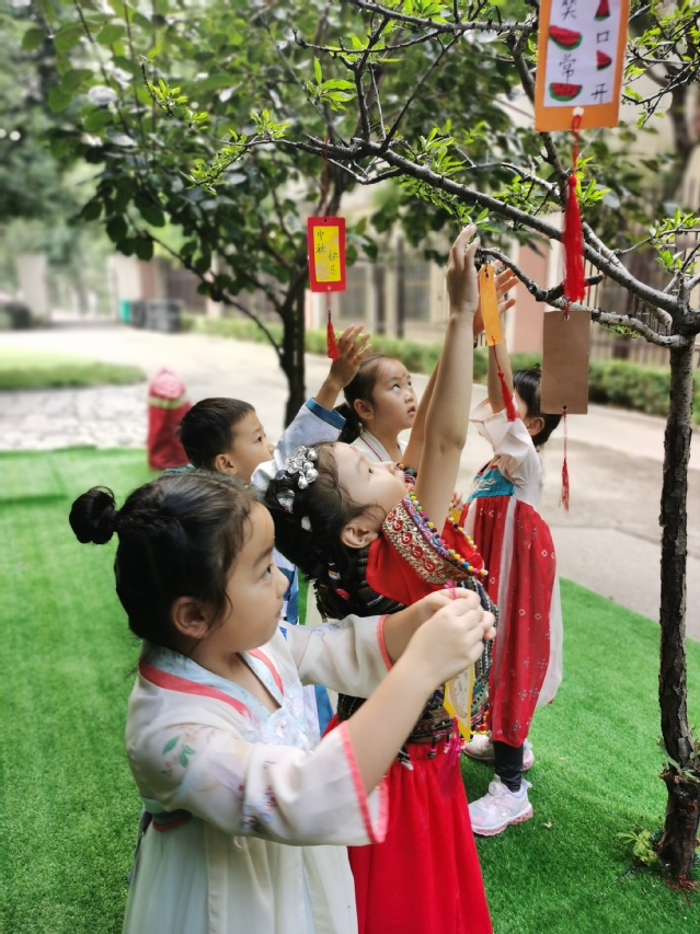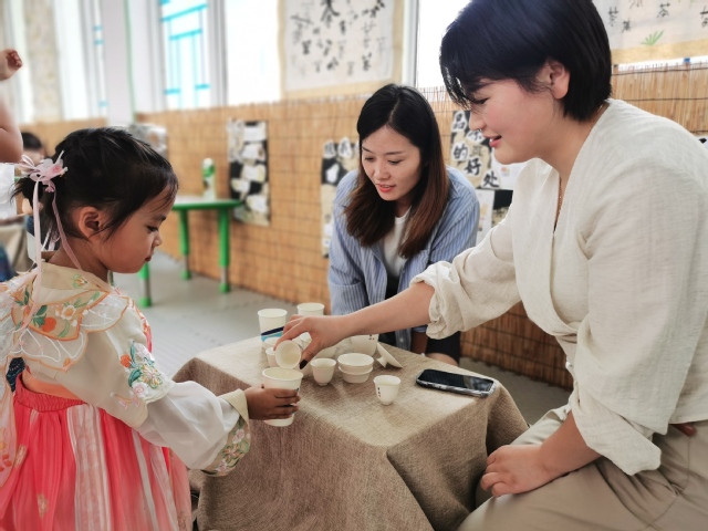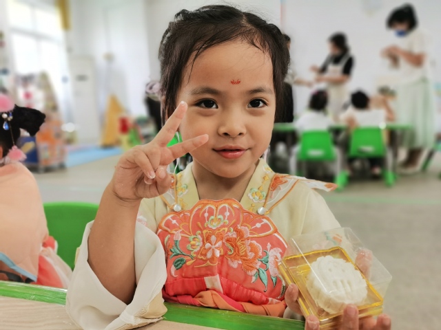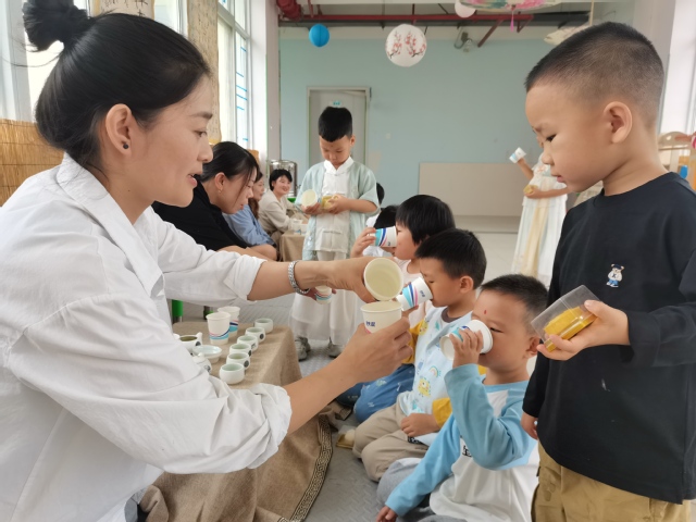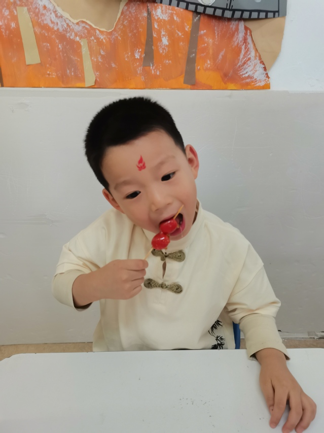 仪式结束,中大班的孩子们边开始了汉服游园活动。在家长志愿者们的帮助下,孩子们亲手制做了冰皮月饼、糖葫芦;在走廊里,老师们精心布置了新中式打卡区与品茗区,中式的淡雅与端庄,让活泼的孩子们都不自觉放轻了脚步。家长志愿者们端坐在茶几前,为前来品茗的孩子们一一介绍着中国的茶文化;“投壶”作为传统游戏,孩子们都已不陌生,一个个摩拳擦掌、跃跃欲试。孩子们通过亲身体验、实际操作,将中国的传统文化的种子深埋于心。