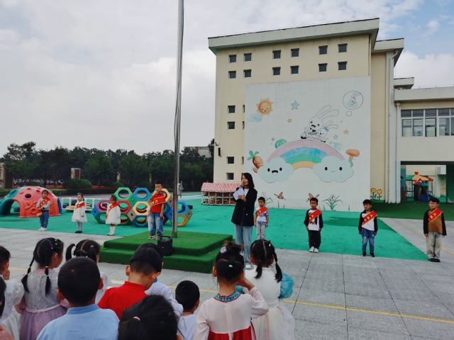 上午9点,全体幼儿在主席台集合,参加升旗仪式。随着五星红旗冉冉升起,童声齐唱国歌,稚嫩的声音里包含了对国家懵懂的热爱。