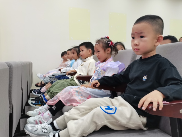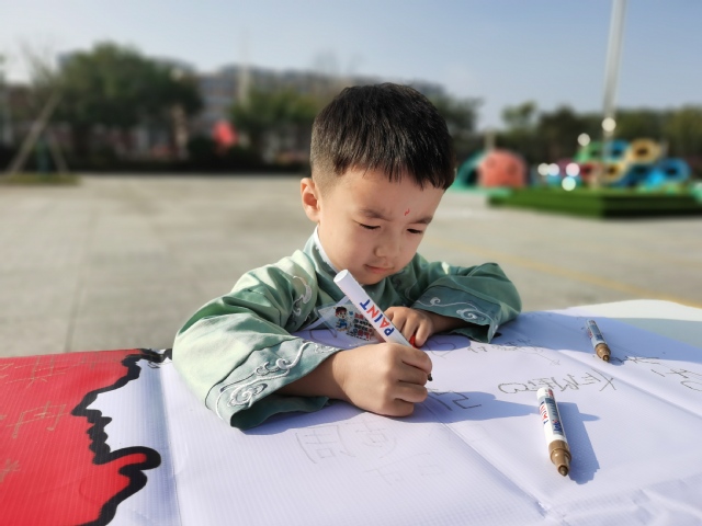 本次活动从晨间入园开始,孩子们身着汉服,由老师在额间贴上花钿,来到中国地图前进行签到,在老师们的引导下一笔一划的书写自己的名字。