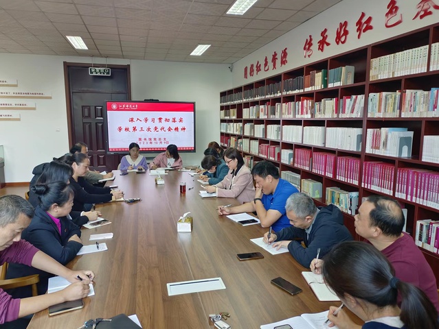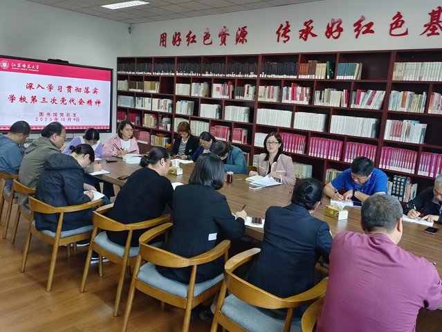 为深入学习贯彻落实学校第三次党代会精神,10月9日下午,图书馆党总支在“红色资源共享空间”召开专门会议,深入学习宣传贯彻落实学校第三次党代会精神。会议由党总支书记韩冰主持,全体支部书记和支部委员参加会议。