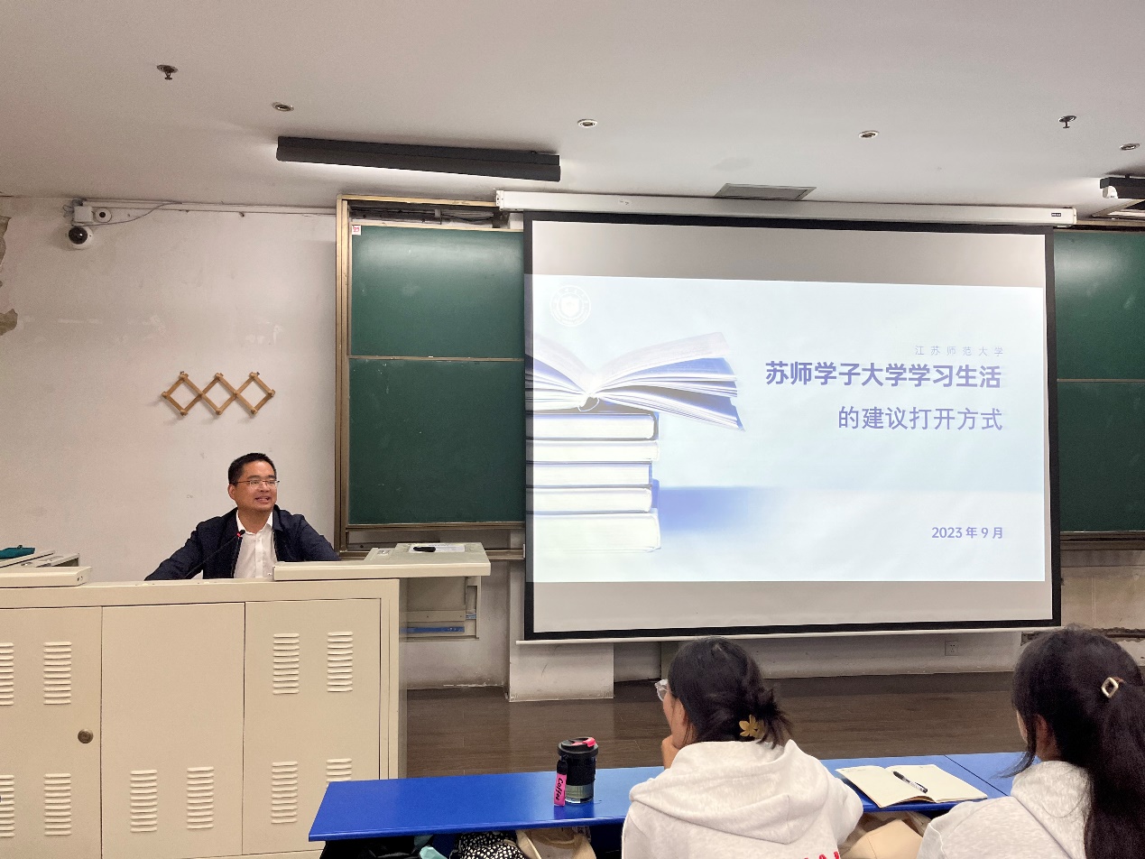 校学生工作处范锋处长为我院新生开设《苏师学子大学学习生活的建议打开方式》专题讲座。范处长首先介绍了江苏师范大学的基本校情校史、办学理念等。接着,范处长对新生今后的学习生活进行具体指导,引导同学们思考如何过好大学生活。他指出:一永远不要忘记,自己的主要任务是学习;二挂科会影响一个人的自信;三上课不能白上课,学会触类旁通;四学会自主学习,自主领会;五常去图书馆,饱览群书。最后范处长通过生动有趣的案例和故事,引导新生学会如何正确对待情感问题,如何处理人际问题,帮助新生培养积极向上的心态,形成良好的交往氛围。