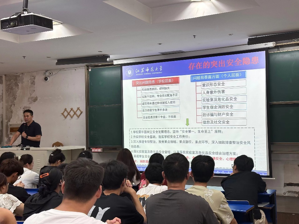 保卫处许继安副处长为新生开展了校园安全教育讲座。许继安副处长以党的二十大报告和习近平总书记的重要讲话为引,强调了安全工作的重要政治意义。讲座中,许处长向新生们强调了校园安全的重要性,以案例分析的形式,形象生动地从人身安全、财产安全、宿舍安全、实验室安全等方面向新生进行安全知识拓展与教育,重点讲述了校园常见的诈骗类型和应对措施。他还介绍了学校保卫处的相关职能,展示了校保卫处的公众号和各类报警号码,让同学们充分认识到“防范刻不容缓”,要时刻保持警惕。
