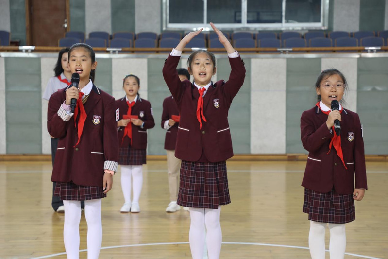 队旗飘飘,薪火相传。伴随着雄壮有力的出旗曲,旗手们迈着整齐有力的步伐出旗。队旗下,队员们齐唱队歌,嘹亮的歌声传递出队员们内心的骄傲与自豪。入队仪式上,周慰校长在致辞中嘱托少先队员们:要牢记少先队的纲领,遵守少先队的章程,顽强拼搏,迎接新时代新的挑战。少先队大队辅导员宋培瑜老师宣读了新队员名单。