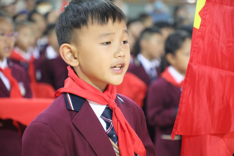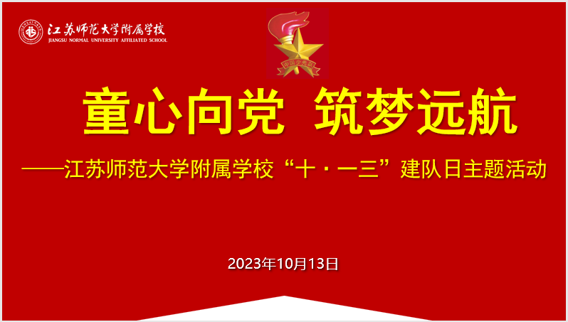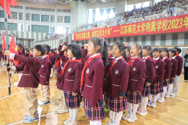 为学习贯彻党的二十大精神,进一步落实《中共中央关于全面加强新时代少先队工作的意见》要求,用实际行动把红色基因一代代传下去,切实做好少先队组织政治启蒙和价值观塑造的主业主责,10月13日上午,江苏师范大学附属学校在江苏师范大学体育馆举行了少先队新队员入队仪式暨“十·一三”少先队建队日主题活动。活动由校大队委成员、四(8)中队孙潇檬、四(2)中队高天昊、大队辅导员宋培瑜老师主持。学校全体师生参加了活动。