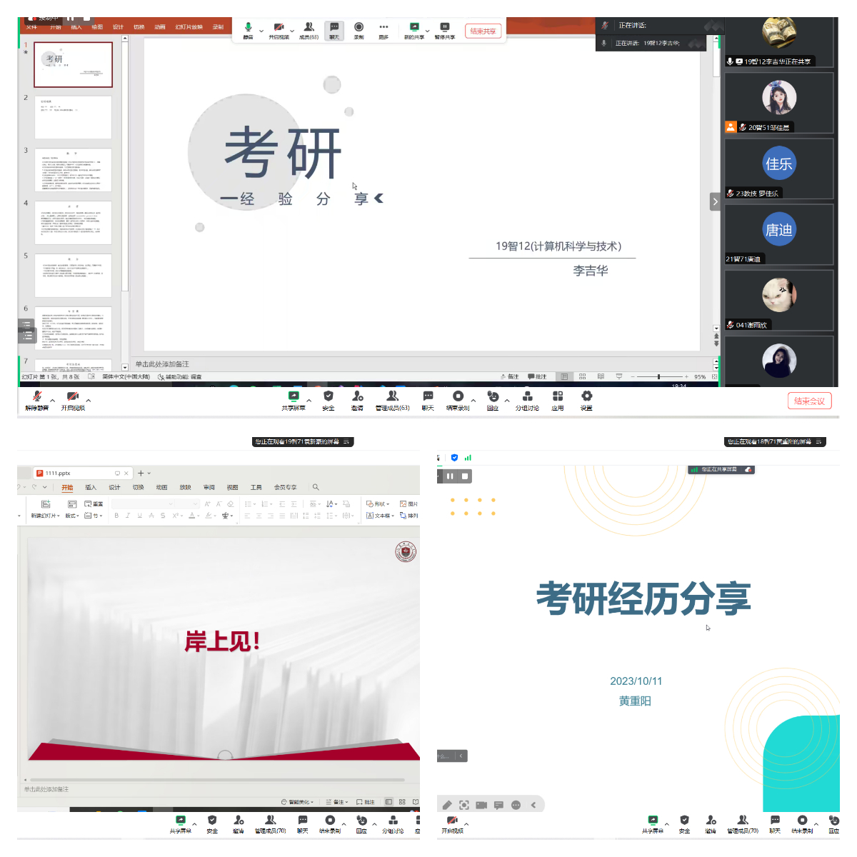 为了帮助同学们更好地了解考研形势,确立合适的考研目标,及时调整备考安排,智慧教育学院于10月13日晚上7点半召开了线上考研经验分享会。本次会议由就业辅导员郁惠玲老师主持,在前期充分了解了考研学生拟报考情况后,分别邀请了考取相关学校和专业的李吉华、袁新豪、黄重阳、宋玥妍、罗佳乐、顾庭轩、刘康等7位毕业生分享备考经验,70余位20级和21级同学参会。