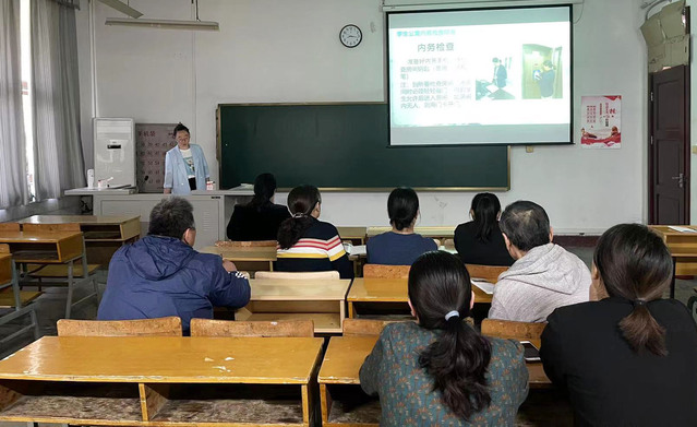 公寓主管赵洁,首先以PPT的形式带领大家共同学习了《学生公寓内务检查标准》、《学生内务检查工作流程》、《学生宿舍检查管理办法》、《日常服务礼仪》等规章制度及规范用语,重点讲解了文明礼仪在日常管理服务中的重要性,强调了学生沟通注意事项及规范评定等级。
