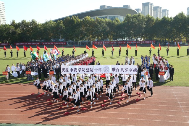 江苏圣理工学院-中俄学院党委书记冯遵永、副院长王莉、党委副书记文雯带领全体教职工及外教,四位俄罗斯舞蹈演员以及五十一位方阵成员组成的运动会方阵队伍进入会场,精彩的开幕式演出上演,身着俄罗斯特色民族服饰的姑娘们用俄罗斯舞蹈诠释了昂扬自信的中俄风采,方阵队伍几经变化,手中的图片也随之变换,最终出现了“融合 共享 卓越”的口号标语,那整齐干脆的动作彰显了中俄学院的团结有序,中俄学子以精湛的才艺赢得阵阵喝彩。