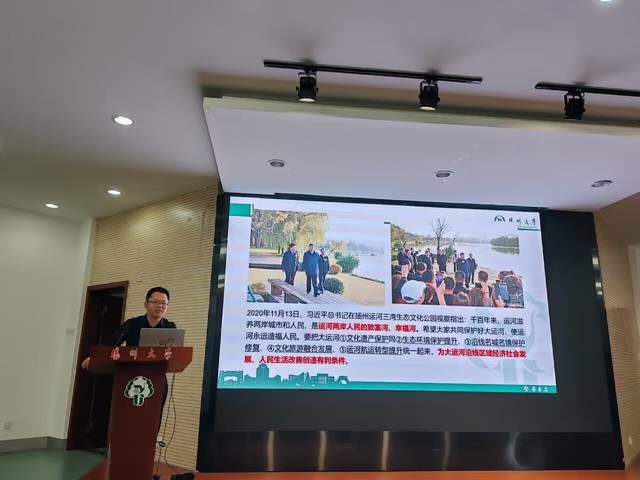 22级旅游管理全体同学和老师16日早晨从师大南门出发前往扬州。在大巴上,戴导首先介绍四天实习行程,随后邀请五位同学展示“导游开局一分钟”,对“新导游”的导游技能进行针对性指导。下午,师生们前往运河三湾景区,重走习近平总书记路线。第二站来到东关街,在这条老街感受扬州的历史文化底蕴与扬州旅游特色。最后师生夜游瘦西湖,沉浸式体验光影魅力和湖的风姿雅韵。17日上午师生们前往扬州大学聆听侯兵教授之大运河文化建设漫谈。侯兵教授强调苏师和扬大是“兄弟高校”,江苏旅游一家人,相互之间要多交流多学习。随后侯教授就大运河文化建设展开漫谈。最后,同学们请教侯教授、余教授有关减缓扬州市旅游交通困境、瘦西湖夜游产品开发等问题。下午两点,师生们前往中国大运河博物馆感悟扬州运河文化底蕴和文旅融合战略思想,聆听志愿者讲解,触摸文字和实物承载的岁月史韵。