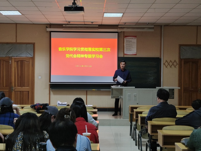 10月18日下午,音乐学院举行贯彻落实校第三次党代会精神专题学习会。学院党委书记高小平同志向全体教职工传达了校第三次党代会精神,并就下一阶段如何贯彻落实校第三次党代会精神、更好促进学院事业高质量发展进行了再部署,再强调。