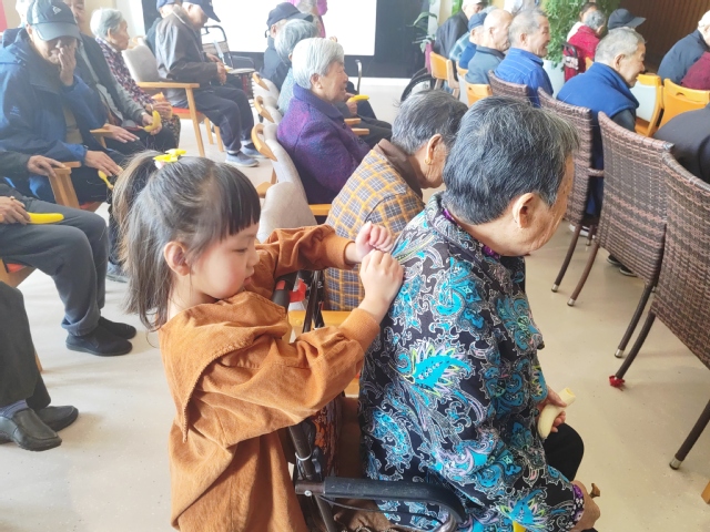 刘老师热情的向爷爷奶奶们介绍幼儿园的孩子,一声声稚嫩的问候,让爷爷奶奶们鼓掌叫好。孩子们站在舞台上,向爷爷奶奶表演准备好的节目,获得一众好评。节目结束,孩子们将带来的礼品分发给台下的爷爷奶奶,有的孩子在送完礼物后,来到爷爷奶奶身后,用小手给爷爷奶奶们捶捶背、捏捏肩,老人们的脸上洋溢着幸福的笑容。