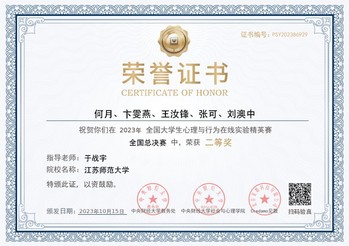 刘澳中:非常荣幸能够参加首届全国大学生心理与行为在线实验精英赛并获奖,感谢主办方的赛前培训和见数平台的支持,感谢于老师的悉心指导和鼓励,感谢何队长的带领和引导,感谢团队成员的互相帮助和配合。经过这次比赛,我对线上实验的优势和便捷性有了更多的认识,感悟到只要大家团结起来,很多事情也不是没有可能完成,方法总比困难多。