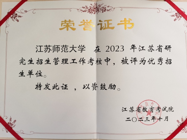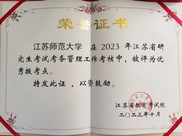 近日江苏省教育考试院召开了2024年全省硕士研究生招生工作会议,全面部署2024年硕士研究生招生考试工作。会议还表彰了2023年硕士研究生招生考试目标管理考核优秀单位。我校获评“江苏省优秀研究生招生单位”和“江苏省优秀报考点”,这是我校连续四年获得双优殊荣。