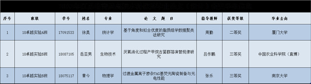 近日,江苏省教育厅公布了2022年度江苏省普通高等学校本专科优秀毕业论文(设计)评选获奖名单,敬文书院3名(全校12人)毕业生的毕业论文获奖。其中数学与统计学院周勤老师指导的18卓越实验A班徐昊毕业论文获得二等奖,生命科学学院吕作鹏老师指导的18卓越实验B班岳亚男、物理与电子工程学院张乐老师指导的黄今同学毕业论文获得三等奖。