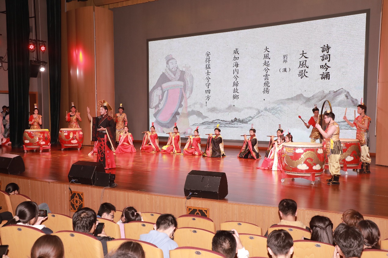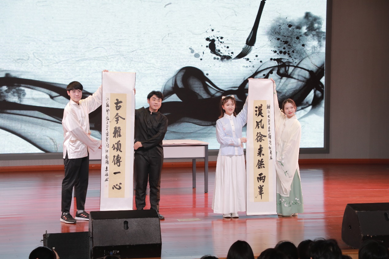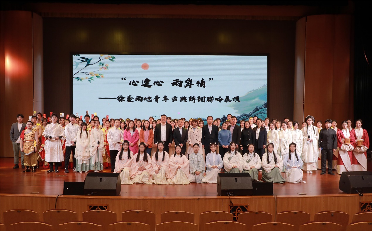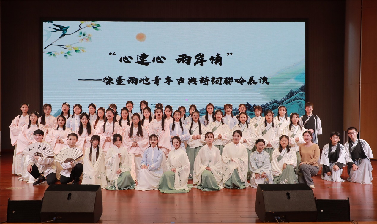 4日晚,“心连心 两岸情”——徐台两地青年古典诗词联吟展演在马可音乐厅举行。演出节目分为“山河有情,日月共辉”“我有嘉宾,情牵汉唐”“君有归期,同饮一觞”三个板块。随着民族乐团《一城山色半城湖》宛转悠扬乐声的响起,演出正式拉开序幕。来自辅仁大学东篱诗社学生的诗词吟诵《八声甘州·对潇潇暮雨洒江天》,让在场的师生感受到了诗词的婉转绵长;文学院悠然诗社的诗词吟诵《关山月》,铿锵有力,气势雄浑;奔放豪迈的吟诵《大风歌》将演出推向了高潮。文学院悠然诗社的学生现场泼墨挥毫,向辅仁大学东篱诗社赠送内容为“汉风徐来系两岸,古今雅颂传一心”的书法作品,祝福两地青年携手共进,建立更加深厚的友谊,将中华优秀传统文化发扬光大。整场演出在两校诗社联袂吟诵的《蓼莪》中落下帷幕。