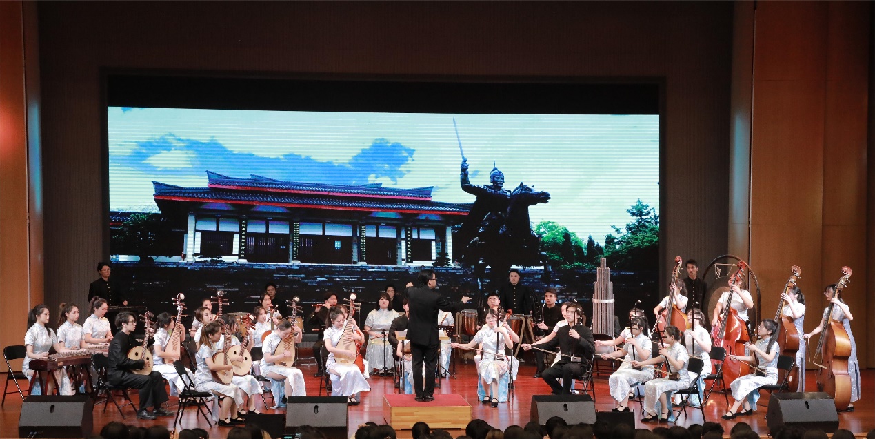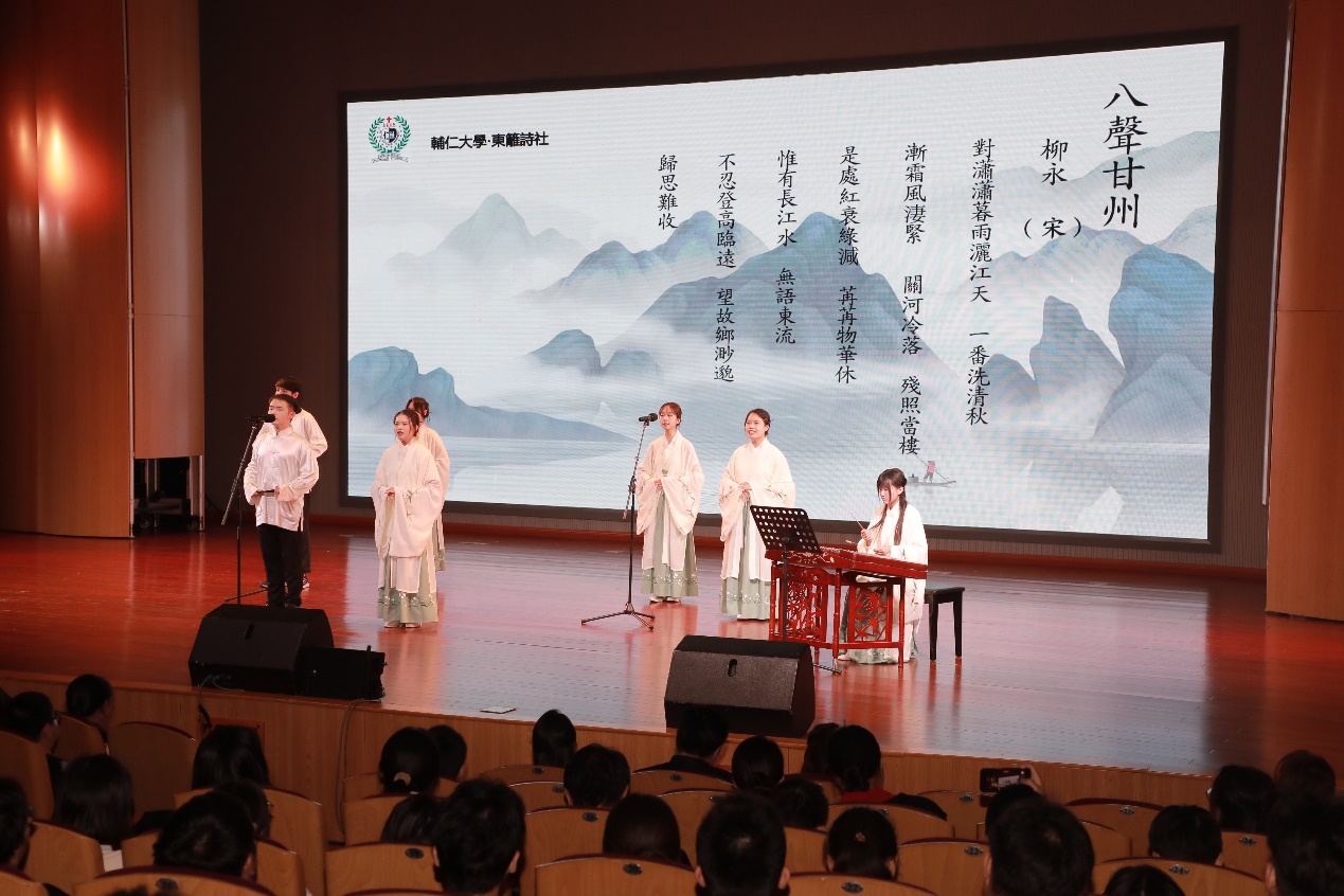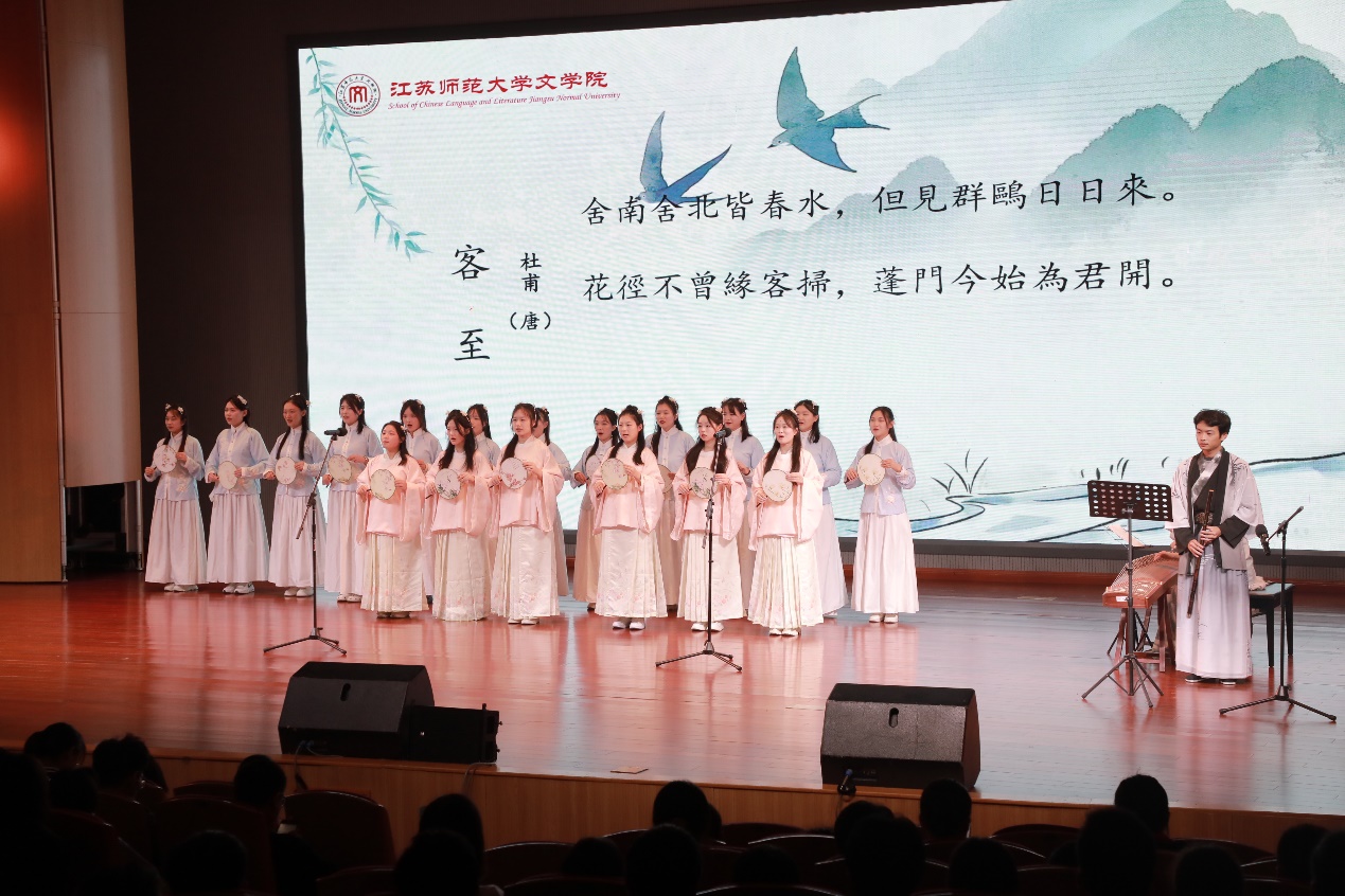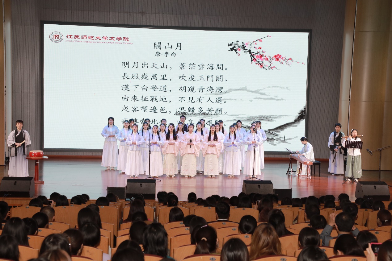 4日晚,“心连心 两岸情”——徐台两地青年古典诗词联吟展演在马可音乐厅举行。演出节目分为“山河有情,日月共辉”“我有嘉宾,情牵汉唐”“君有归期,同饮一觞”三个板块。随着民族乐团《一城山色半城湖》宛转悠扬乐声的响起,演出正式拉开序幕。来自辅仁大学东篱诗社学生的诗词吟诵《八声甘州·对潇潇暮雨洒江天》,让在场的师生感受到了诗词的婉转绵长;文学院悠然诗社的诗词吟诵《关山月》,铿锵有力,气势雄浑;奔放豪迈的吟诵《大风歌》将演出推向了高潮。文学院悠然诗社的学生现场泼墨挥毫,向辅仁大学东篱诗社赠送内容为“汉风徐来系两岸,古今雅颂传一心”的书法作品,祝福两地青年携手共进,建立更加深厚的友谊,将中华优秀传统文化发扬光大。整场演出在两校诗社联袂吟诵的《蓼莪》中落下帷幕。