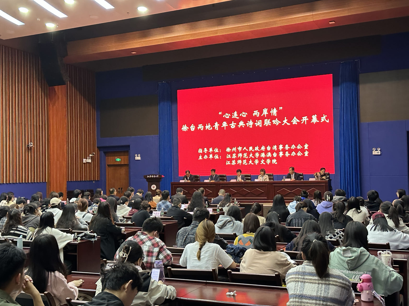 11月4日上午,“心连心 两岸情”——徐台两地青年古典诗词联吟大会开幕仪式于江苏师范大学分析测试中心100报告厅举行。校党委常委、副校长娄峥嵘,徐州市人民政府台湾事务办公室主任姜明,台湾辅仁大学中国文学系主任王欣慧,我校文学院教授李昌集、朱存明,校“美育名师工作室”项目负责人王淑梅教授等出席开幕式,辅仁大学东篱诗社、我校文学院悠然诗社及部分师生代表参加活动。