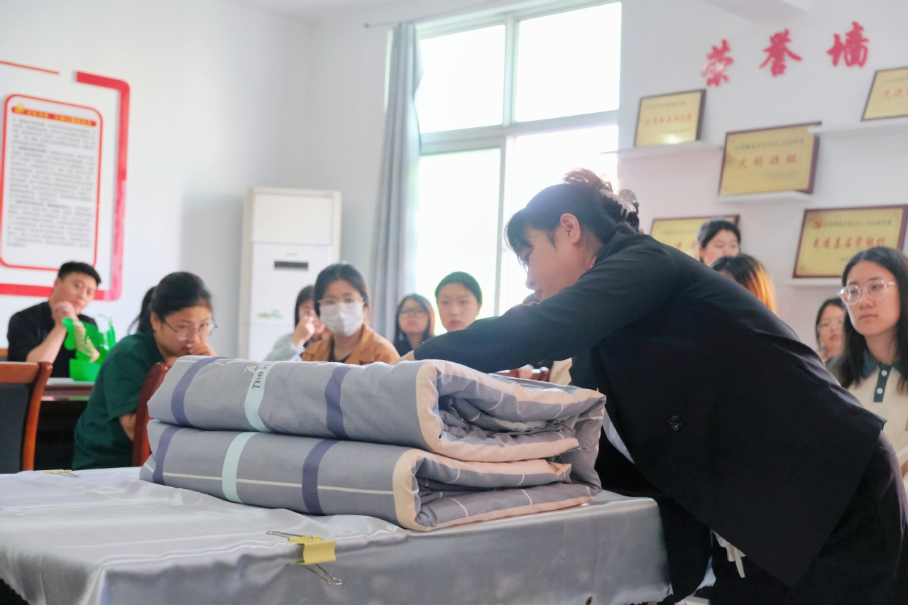 小课堂分两个环节,第一环节同学们观看内务整理、宿舍清扫及物品整理的教学视频,实操环节6组团的张红阿姨现场耐心地教授同学们被子“豆腐块”的叠放方法,可以简单总结为“铺、折、捏、叠、调、摆”六步;14组团曹颖阿姨则从申请房间保洁流程及注意事项给大家一一做了详细地解说;3组团王晴阿姨通过不同种类的衣服具体展示了四种衣物收纳方法,收纳后的衣物整齐、美观、一目了然;最厉害的要数9组团的董广云阿姨教大家变废为宝,一个个废弃的空洗衣液瓶子,经过董阿姨的修修剪剪、加上美院同学们涂涂抺抺的神助攻,成为了既美观又实用的收纳神器。