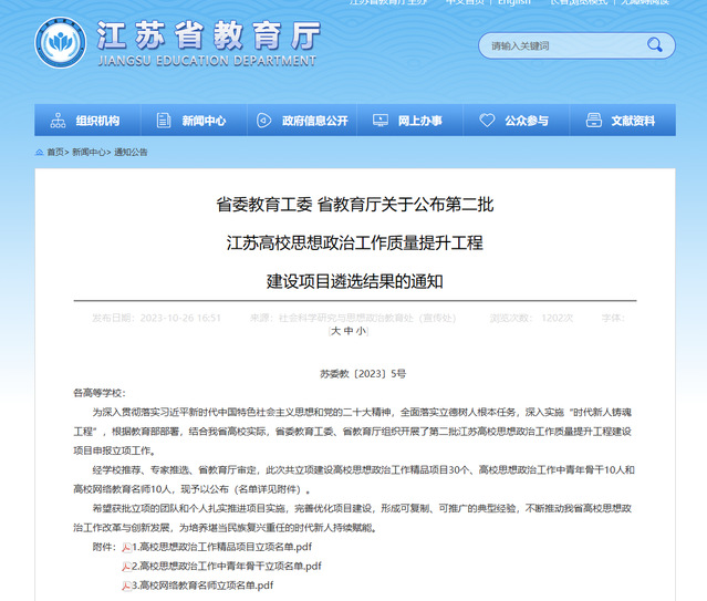 江苏高校思想政治工作质量提升工程是省委教育工委、省教育厅为深入贯彻落实习近平新时代中国特色社会主义思想和党的二十大精神,全面落实立德树人根本任务,深入实施“时代新人铸魂工程”所推动的重要项目。此次共立项建设高校思想政治工作精品项目30个、高校思想政治工作中青年骨干10人和高校网络教育名师10人。