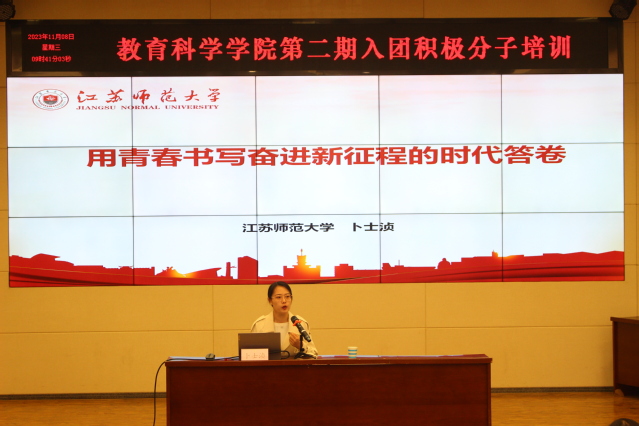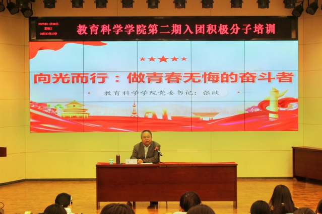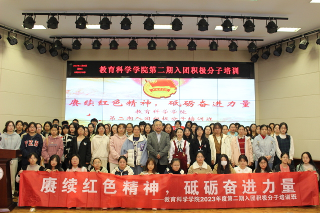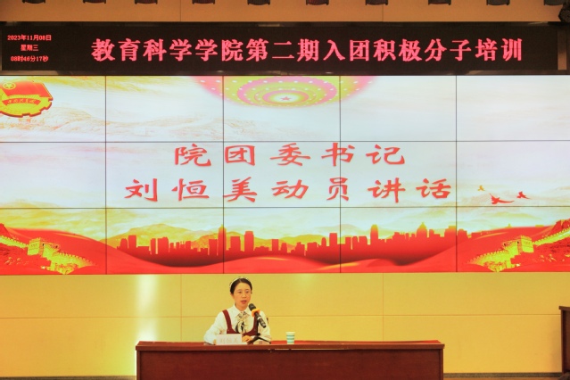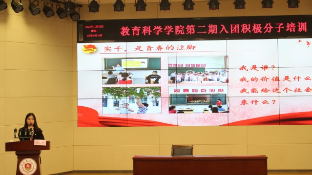 为提升青年学生的政治理论水平和思想觉悟,严格落实中国共产主义青年团团员发展制度,提高团员发展质量,教育科学学院团委于2023年11月8日上午在学院106报告厅举办第二期入团积极分子培训。培训主题为“赓续红色精神,砥砺奋进力量”,共有 75名入团积极分子参与了本次培训。