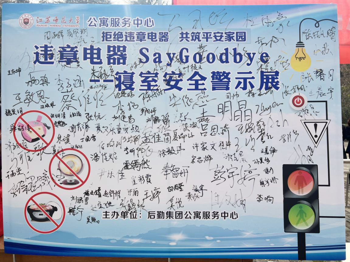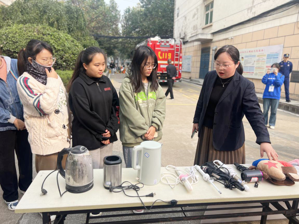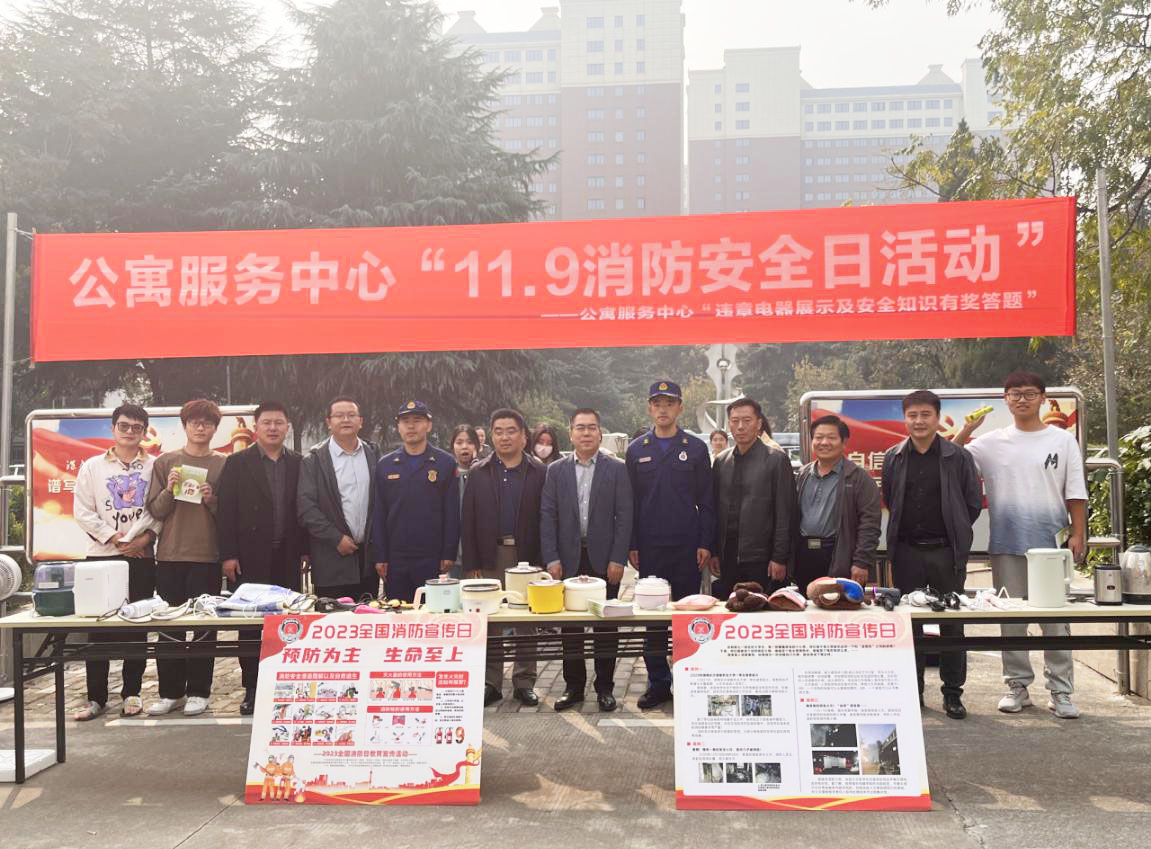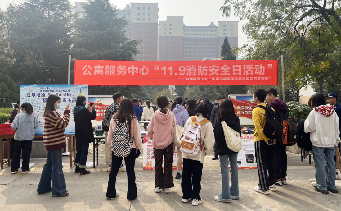 2023年11月9日是全国第32个消防安全日,安全践于行,防患贵于恒。为营造安全和谐的校园学习生活环境,让同学们充分认识到使用违章电器的危害性。提高同学们“祸在一瞬,防在平时”的安全防患意识,共建安全宿舍环境,公寓服务中心联合校保卫处、铜山区消防救援大队于11月9日上午11点开展了以“拒绝违章电器,共筑平安宿舍”为主题的宣传活动。
