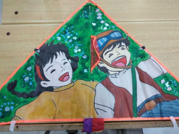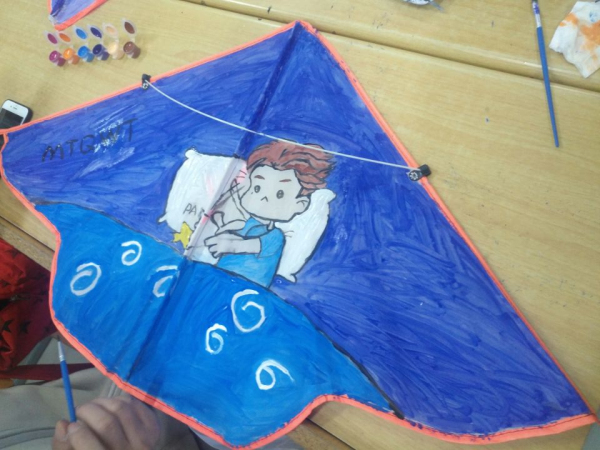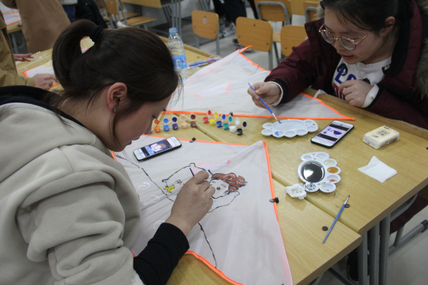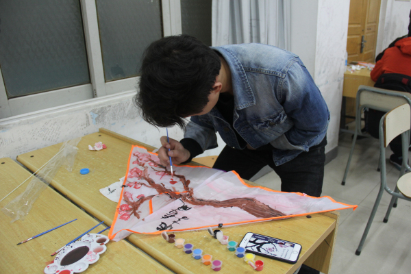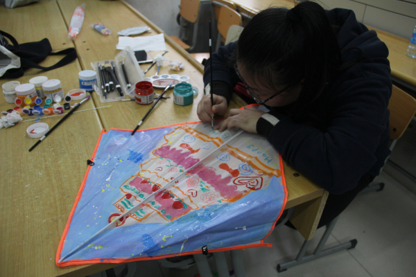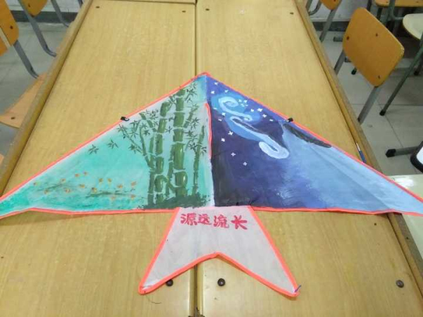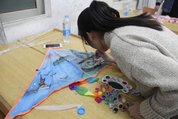 赛前,工作人员贴心地为大家提供了白色风筝、涂料以及各种绘画工具,并现场指导选手们如何调色等专业知识。活动中每个参赛团队打水、调颜料、勾勒线条、上色,配合的十分默契、有条不紊,手中的画笔在洁白的风筝上飞舞。绘制时间结束后,同学们展示出的作品中有悠然如梦的彩色春景,也有畅游在辽阔星空的蓝鲸;有层峦耸翠的山水美景,也有栩栩如生的动漫形象;有飘然若仙的仙子,也有充满趣味的创意图案。