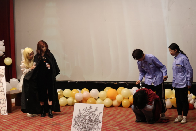 载歌载舞,灯火辉煌,本次晚会共分为三个篇章。第一篇章“悦征程·追光而遇”,开场由雅润学堂带来了古典舞《兰亭序》,她们若惊鸿般翩跹,如游龙般矫健,优美的舞姿令人动容。紧接着由祝欢、叶怡莎、王少琛三位同学分别带来歌曲《Wonderful U》《赤伶》《Simon》,动人心弦,戏腔婉转,余音绕梁,唱出了青春的活力与热情。在反诈话剧《莴苣姑娘》带来的欢声笑语中,晚会进入了第二篇章。