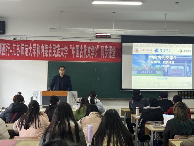 11月14日下午,江苏师范大学文学院与内蒙古民族大学师生依托智慧树平台联合开展了“中国古代文学3”同步课堂第二次教学活动。本次活动由文学院院长王立增教授主讲,内蒙古民族大学王双梅老师、王若明老师与该校汉语言文学专业、汉语国际教育专业本科生远程参与。
