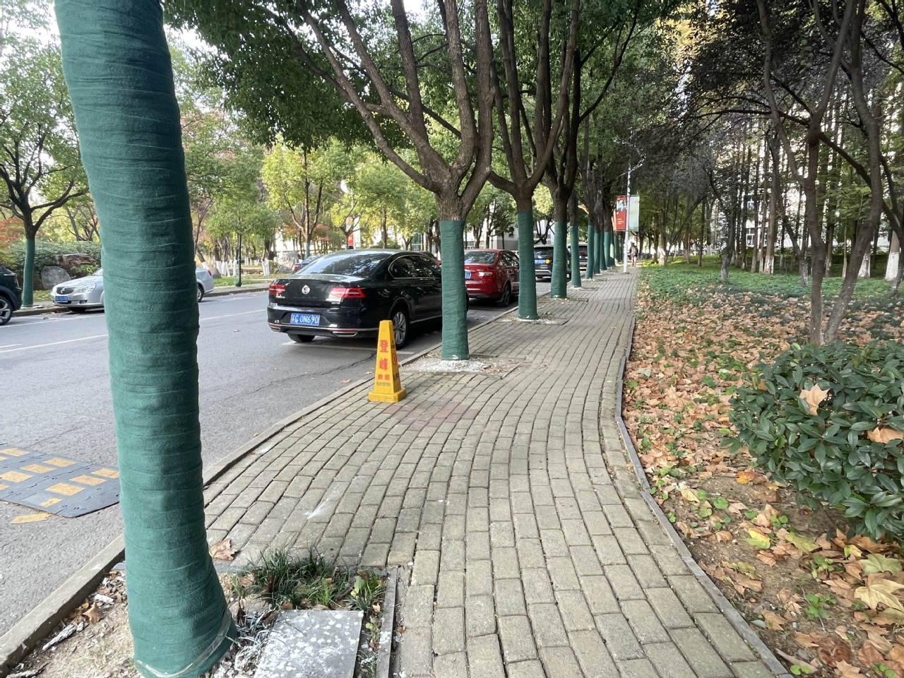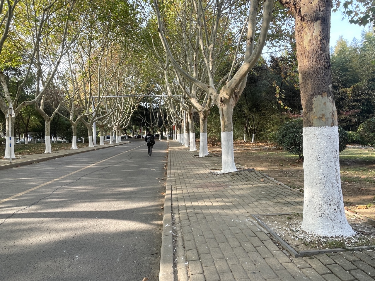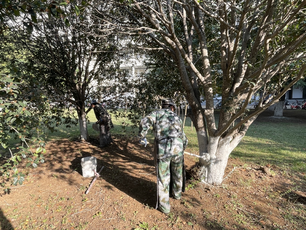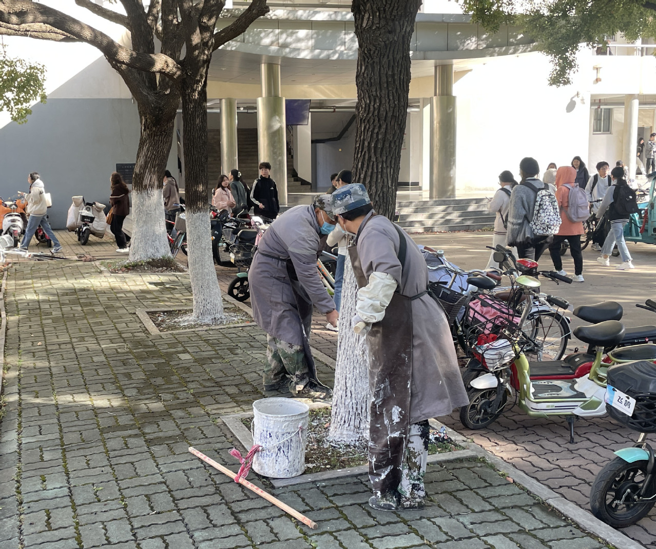 所谓三分种植,七分养护,校园内随处可见养护人员弯着腰清理树身灰尘、泥土,拿着工具均匀地给树干裹上“冬季防护服”,忙碌的身影穿梭在校园道路两侧、草坪花丛中。为做好校园树木的养护和管理,物业服务中心本着“早准备、早部署、早行动”的工作方针,提前采购了近4吨新型专用的环保涂白剂,对泉山、云龙校区两校区树木进行涂白。为确保涂刷质量,中心严格按照规范对操作技术环节进行统一要求,将涂白工作精细化,并统一标准线,做到止口平整,不留死角。对个别树皮裂缝、洞孔、树杈等处重复进行刷涂作业,确保涂刷均匀,避免涂刷流失、刷花、刷漏、干后脱落等现象。漂亮的树木“冬衣”毅然成为了校园冬季里一道独特的亮丽的风景线。