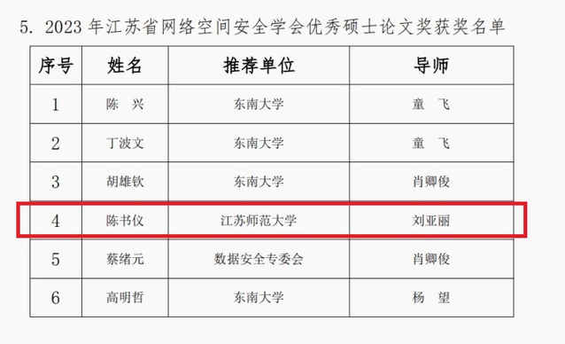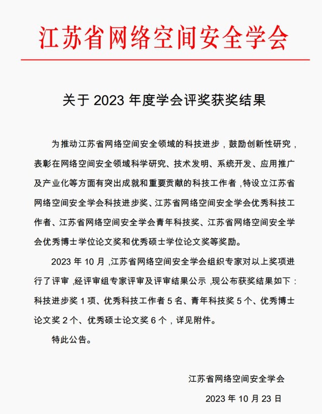 近日,经评审组专家评审及评审结果公示,江苏省网络空间安全学会最终评选出6篇优秀硕士论文。我院刘亚丽教授指导的2020级硕士研究生陈书仪的硕士毕业论文《面向车联网的群组认证协议研究》荣获“2023 年江苏省网络空间安全学会优秀硕士论文奖”,特此祝贺!
