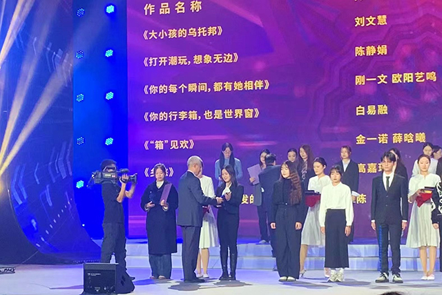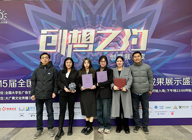 2023年11月25日,第15届全国大学生广告艺术大赛学科竞赛成果展示颁奖盛典在中国传媒大学举行。传媒与影视学院副院长何靖,广告系教师姜吉荣,传媒与影视学院学生白易融、付程艺、孙诗旭、韩灿阳受邀参加活动。