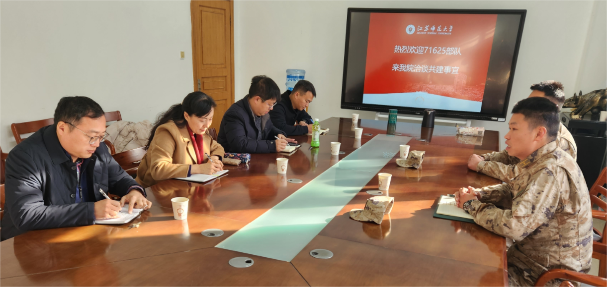 房冬梅院长从学院发展历程、学科特色、重点实验室、师资队伍、特色化专业等方面介绍了我院办学情况。房冬梅院长表示,江苏师范大学体育学院与部队有很好的共建传统,希望以后能与71625部队在大学生应征入伍、国防教育和爱国主义教育基地,帮助学院开展国防教育活动,以及对部队军体建设等方面相互支持,实现共建共赢。座谈会上,双方还就进一步密切军校关系达成共识,希望在各方面深入合作、互通有无,共建军校鱼水情。